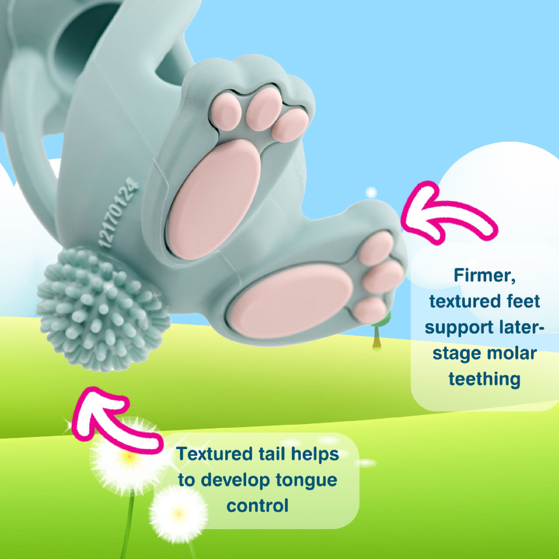 Product Description: Introducing the brush-baby Bobbie Bunny Teether, the adorable and practical baby teether toy. Bobbie Bunny is a teether that’s baby-sized, soft, and safe, making it the perfect companion for your little one’s teething journey. This versatile infant teether is ideal for teething babies and provides soothing comfort to your baby’s gums when teething. This teether is also fridge and freezer friendly for extra soothing relief. The textured feet, ears, and tail of this infant teether are ideal for soothing your baby's tooth and gum pain. Your little one will love to chomp on Bobbie Bunny’s specially crafted textured surfaces. The surfaces of this special teether toy have been created to support every teething stage and relieve your baby’s irritated gums that they may have when teething. Pair with tooth numbing gel for extra relief.