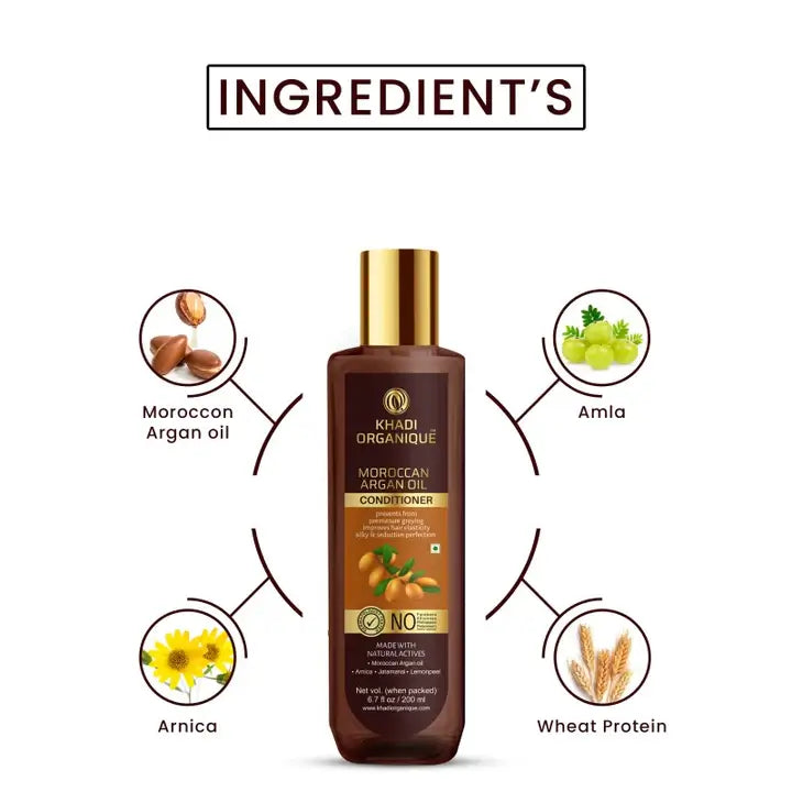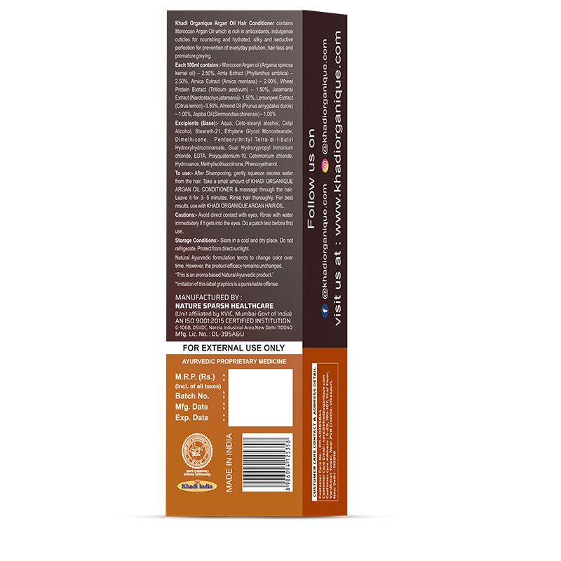 Khadi Organique Argan Oil Hair Conditioner contains Moroccan Argan Oil which is rich in antioxidants, indulgence cuticles for nourishing and hydrated, silky and seductive perfection for prevention of everyday pollution, hair loss and premature greying.
