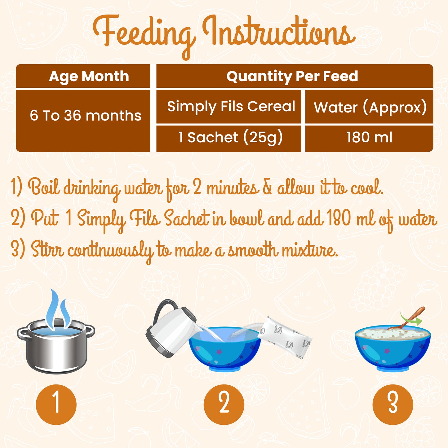 - Mix the recommended quantity of water 180ml with Simply Fils cereal sachet gradually, stirring continuously to make a smooth mixture.