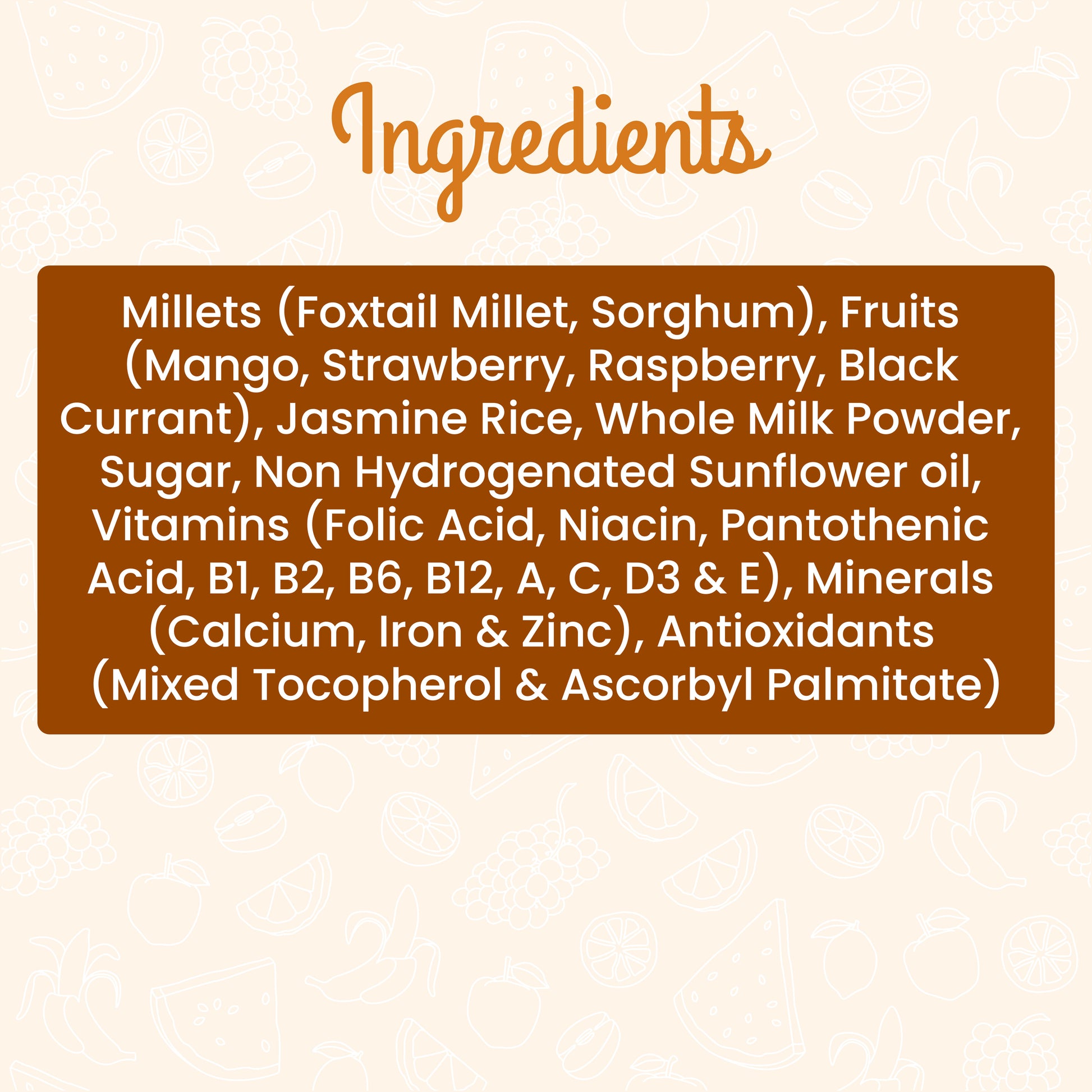 Millets (Foxtail Millet, Sorghum), Fruits (Mango, Strawberry, Raspberry, Black Currant), Jasmine Rice, Whole Milk Powder, Sugar, Non-Hydrogenated Sunflower oil, Vitamins (Folic Acid, Niacin, Pantothenic Acid, B1, B2, B6, B12, A, C, D3 & E), Minerals (Calcium, Iron & Zinc), Antioxidants (Mixed Tocopherol & Ascorbyl Palmitate)