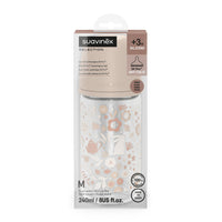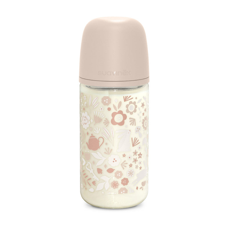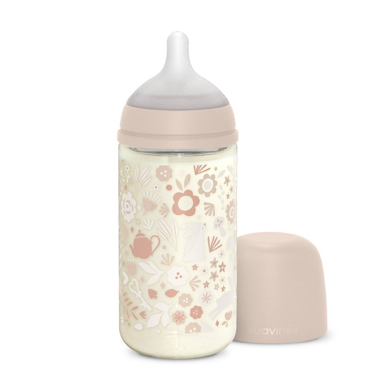 - 240 ml Glass Baby Bottle from the Wonderland Collection of the Suavinex Selection range. 100% recyclable bottle. Does not absorb odors or flavors from food. Baby Bottle with SX Pro Physiological Silicone Teat, Medium Flow, +3 Months. The Suavinex SX Pro physiological teat is the definitive step towards more natural feeding. Designed to respect the babys oral development. The SX Pro physiological teat ensures that the tongue remains in the same natural position as when the baby is breastfeeding. Medium flow bottle teat (+3 Months). Allows all types of medium-density liquids to pass through. Ideal for milk, juices, or water. With anti-colic valve. Teat made of ultra-soft, fine silicone with a sandblasted finish that imitates the texture and consistency of the mothers nipple, achieving maximum warmth, super-flexible movement, and maximum adaptation to the shape of the palate. Features of the SX Pro Physiological Teat: Flat, Symmetrical Tip: Leaves room for the tongue to rest. Neck Centered on the Base: Adapts and becomes more comfortable as the baby grows. 20 mm Long Neck: Reaches the junction between the hard and soft palate. Concave, Curved Base: Allows the mouth, tongue, and jaw to be positioned correctly. SX Pro Teat Endorsed by the Spanish Society of Pediatric Dentistry (SEOP). This bottle is part of the Wonderland collection of the Suavinex Selection range.100% recyclable bottle.It does not absorb odors or flavors from food.SX Pro Physiological Silicone Teat Bottle, Medium Flow, +3 Months. It allows all types of medium-density liquids to pass through. Ideal for milk, juices, or water.