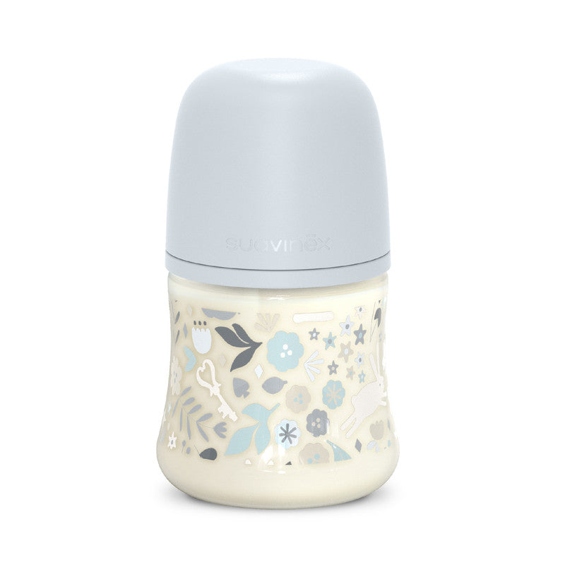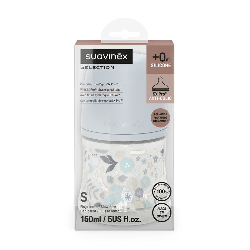 Suavinex Polyamide Baby Bottle with Slow Flow Physiological Teat (+0 Months) from the Wonderland Collection of the Suavinex Selection Range, 150ml. Completely transparent, lightweight, and easy-to-handle plastic bottle.
