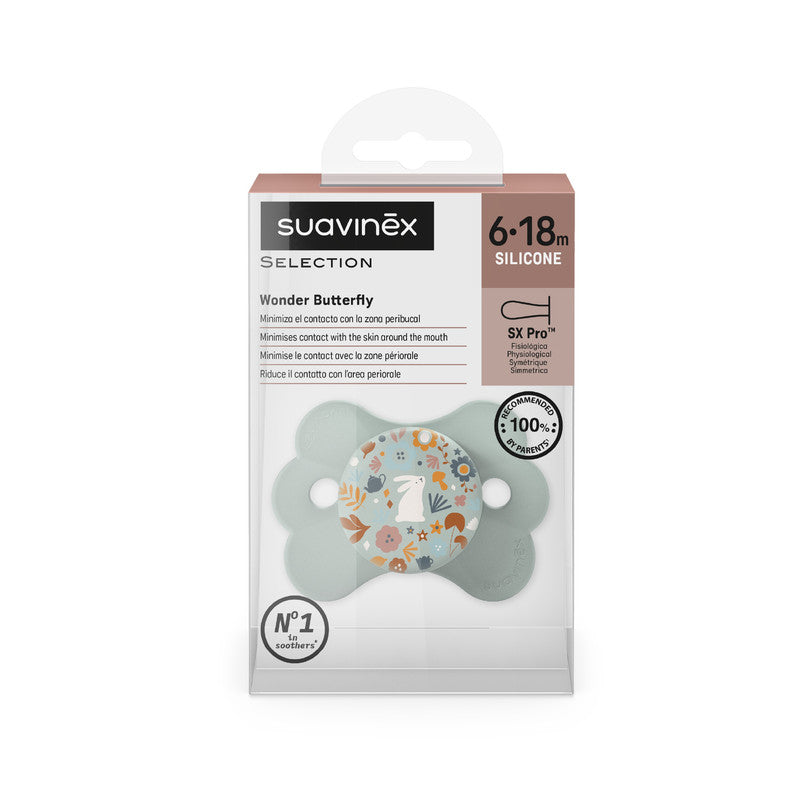 Suavinex Sx Pro Wonderland Butterfly pacifier, 6-18 months. The closest thing to not having a pacifier at all. Designed to respect babys oral development. With a convex shield that helps prevent irritation in the perioral area and no ring for autonomy.
