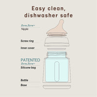 Zero Zero bottles incorporate an anti-colic bag that contracts at the rate that the baby sucks, preventing the entry of outside air to compensate for the vacuum produced inside. An effective system that prevents air intake and prevents it from oxidizing milk and nutrients, especially breast milk.