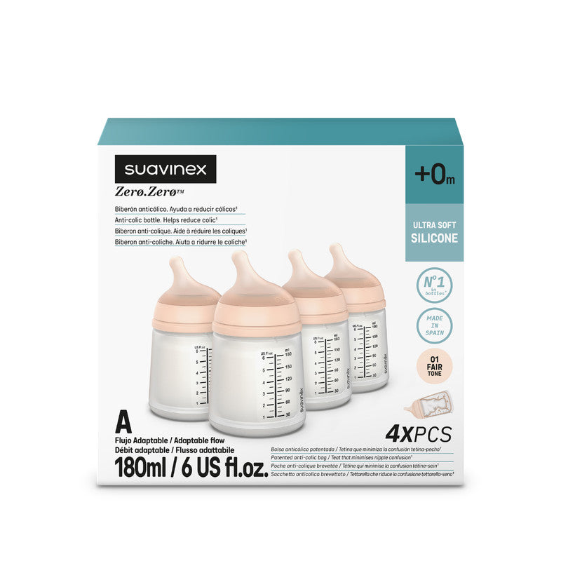 - Suavinex Zero Zero Anti Colic Baby Bottle, No 1 Spanish Baby Bottle Brand, Minimizes Bottle Rejection & Nipple Confusion, Perfect for Breastfeeding Babies, Adaptable Flow, 4 Pk 180ml, LightADAPTABLE (A) FLOW puts baby in control of their milk delivery, replicating the natural breastfeeding process. No matter the bottles angle, even when upside down, milk only flows when your baby sucks. As their suck grows stronger, they extract more milk mirroring the gentle pull of breastfeeding.